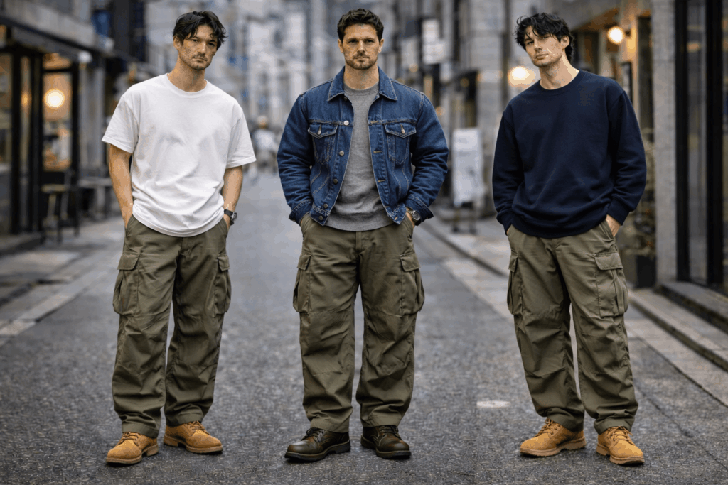 太いシルエットを活かしやすいので、今っぽく見せやすいです。パーカー、オーバーサイズT、スニーカーが合わせやすい。ストリートはビッグシルエット主体で、M-51の太さと相性がいいです。