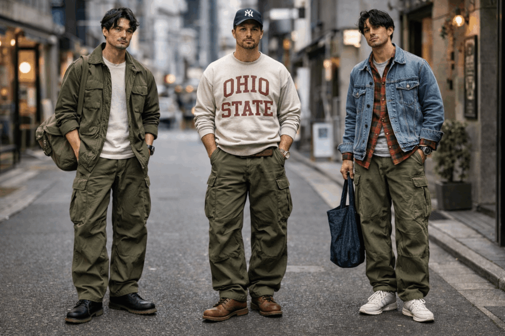 無地T、スウェット、デニムジャケット、ワークブーツみたいな合わせ方ですね。アメカジはデニムやチェックシャツなどを使う定番カジュアルとして挙げられていて、M-51パンツの無骨さとも噛み合います。