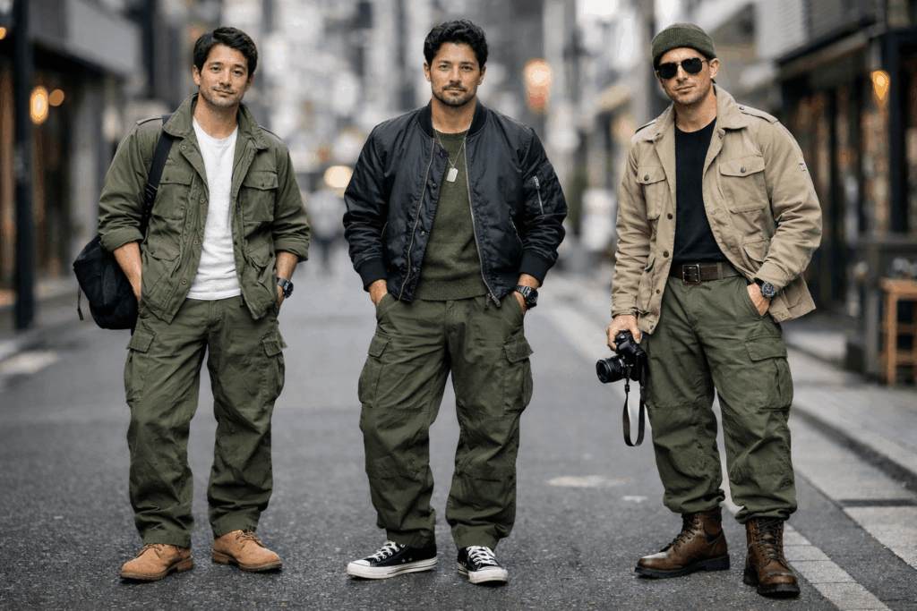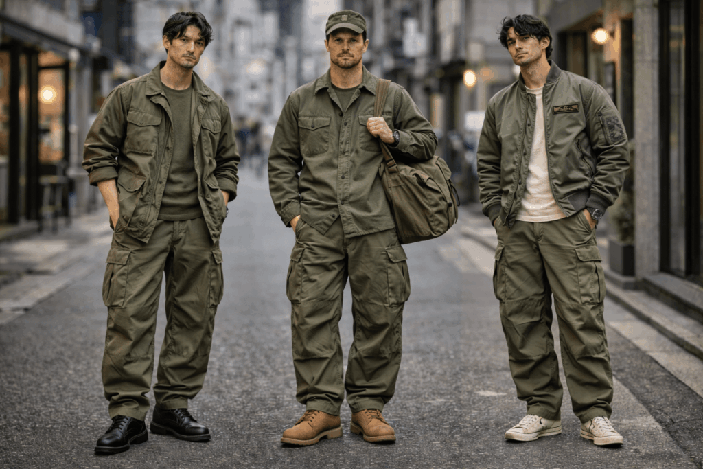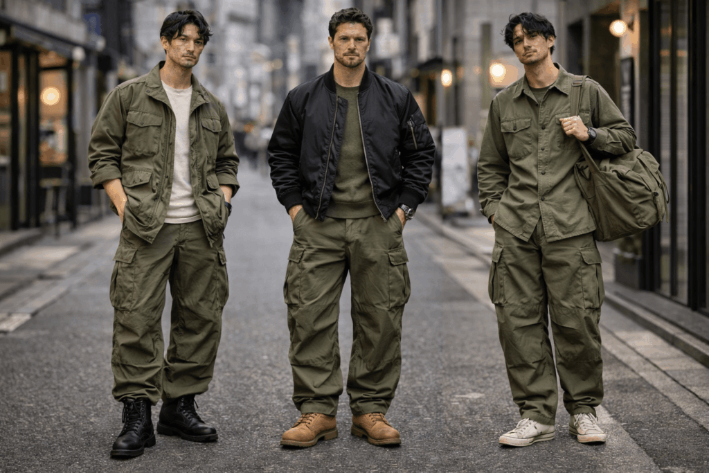 M-51自体が軍物由来なので、MA-1、M-65、ミリタリーシャツ、ブーツなどと相性バッチリ!メンズ系統の解説でも、ミリタリーは軍用ウェア由来・カーキやオリーブ中心のスタイルです。
