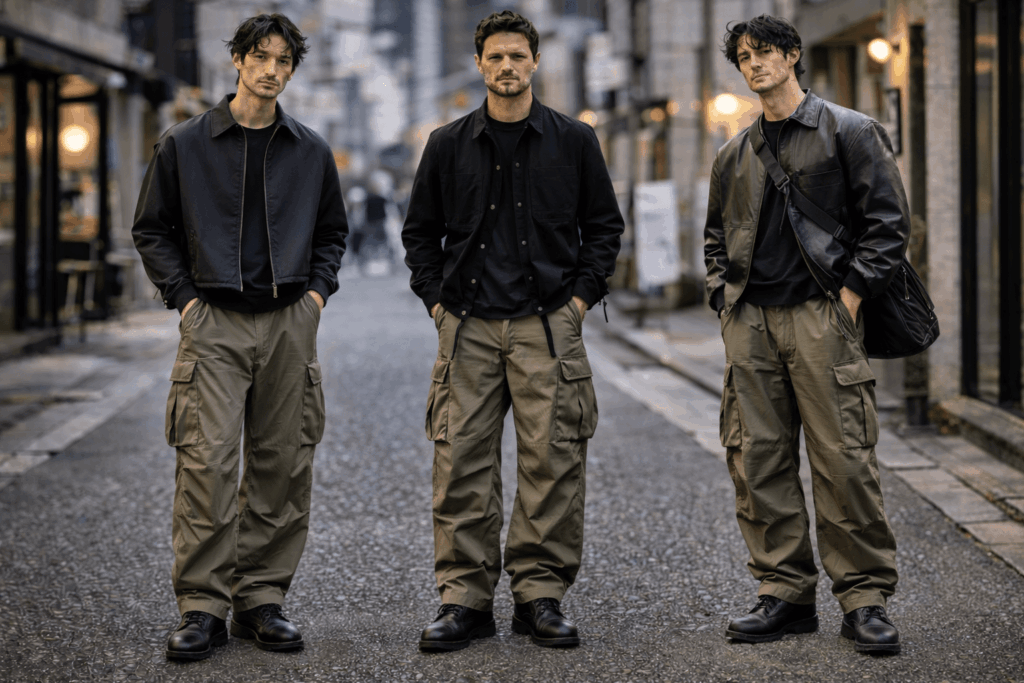 黒トップス、短丈アウター、革靴やボリューム靴で寄せるやり方です。M-51を土臭く見せず、都会的に使いたいとき向け。メンズ系統の分類でも、モードは主要ジャンルのひとつとして挙げられています。