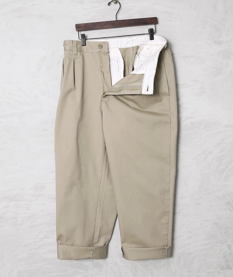 実物は良くも悪くも軍パンらしいクセが残る個体があり、そこが「雰囲気」ではなく「差」になって出ます。ここでいう「軍パンらしいクセ」は、腰回りの立ち上がり、股上の深さ、太ももから裾にかけての落ち方などに出ます。現代のチノパンみたいに“きれいに整う”というより、無骨なシルエットが残るイメージです。