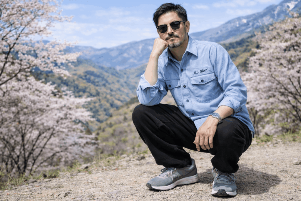 シャンブレーの作業着感とワークパンツがよくなじみ、無理なく渋く見せられます。
