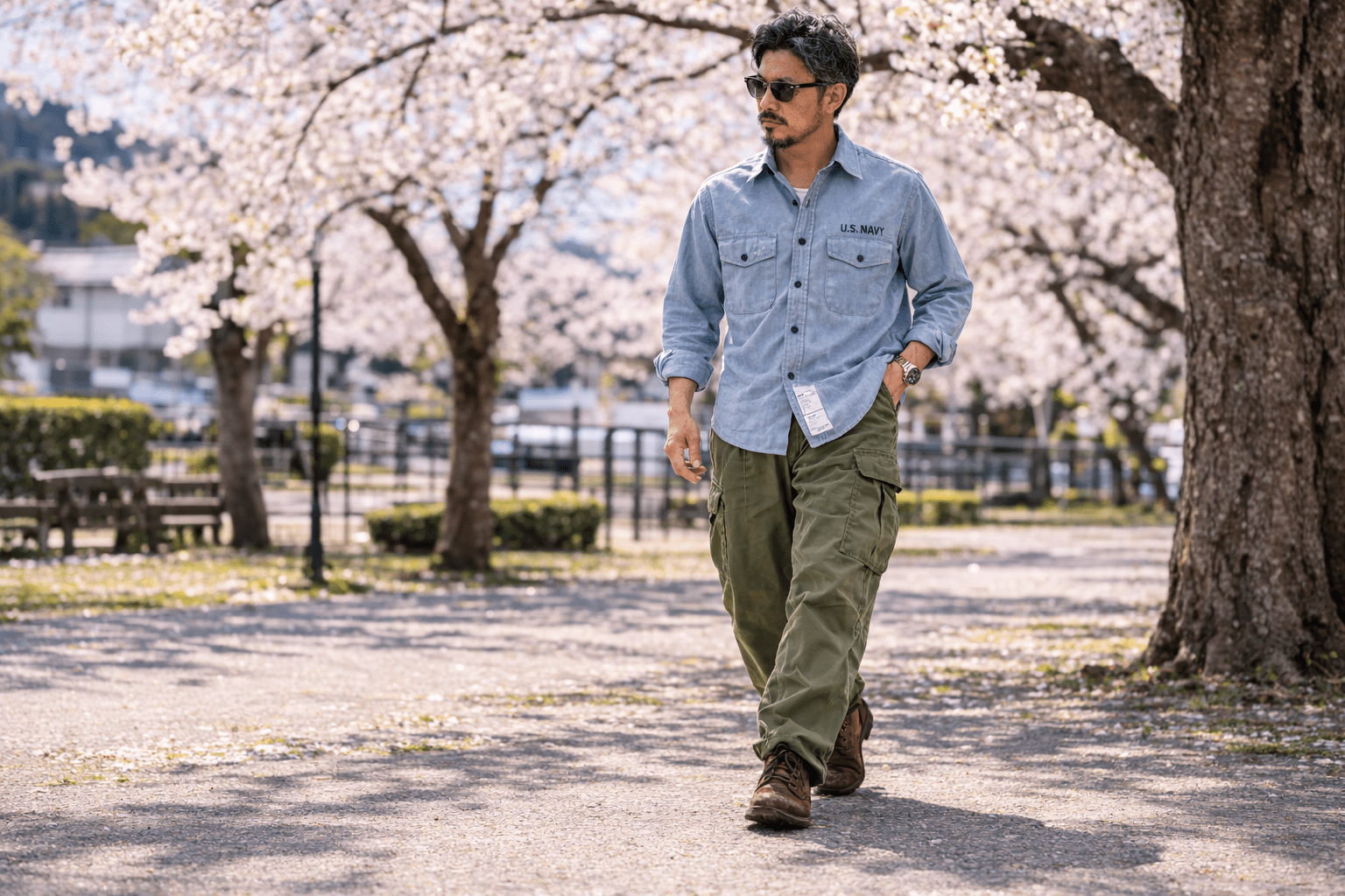 U.S.NAVYシャンブレーシャツの春らしい定番コーデ